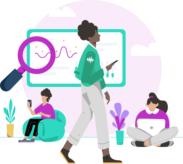 Two teens are holding their phones, and a third teen is on a laptop. In the background, a magnifying glass hovers over trend graphics.